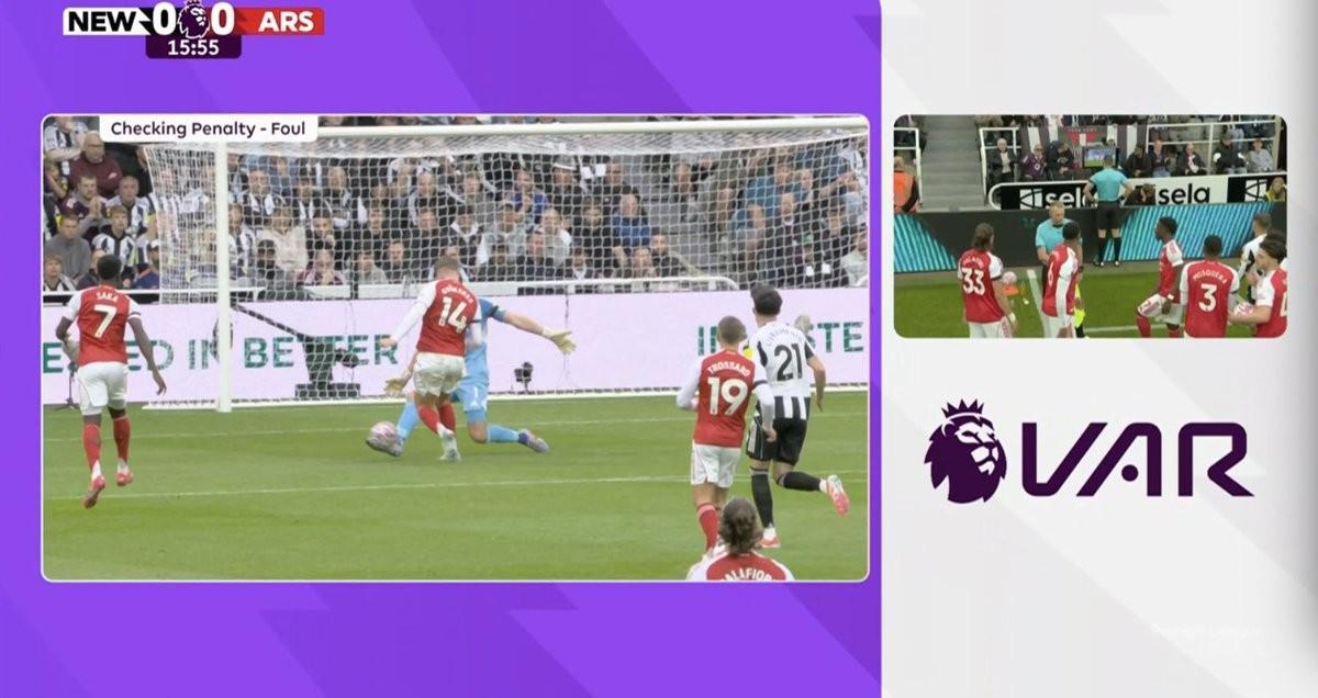 比赛进行到关键阶段时,纽卡门将波普出击放倒枪手前锋哲凯赖什,主裁判吉列当即判罚点球。然而,VAR裁判达伦-英格兰迅速介入,要求查看回放并多次强调:“守门员碰到球了吗?我认为他碰到了球。”在得到VAR助理裁判确认后,达伦-英格兰明确指出:“波普先碰到球,之后才有身体接触。因此,那不是点球。”