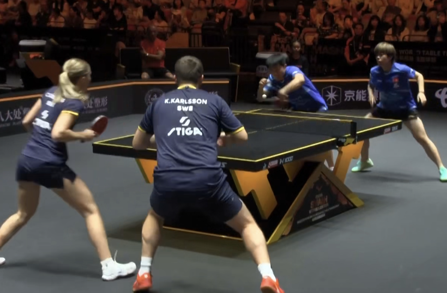 第二局,中国组合延续强势开局,以3-1领先。袁励岑在护台环节表现尤为突出,通过大角度防守打乱对手节奏,局中以5-2迫使对手暂停。暂停归来,卡尔森试图通过台内拧拉追分,但袁励岑/王艺迪凭借出色的护台面积和发球得分能力,以11-4轻松再下一城,大比分2-0领先。