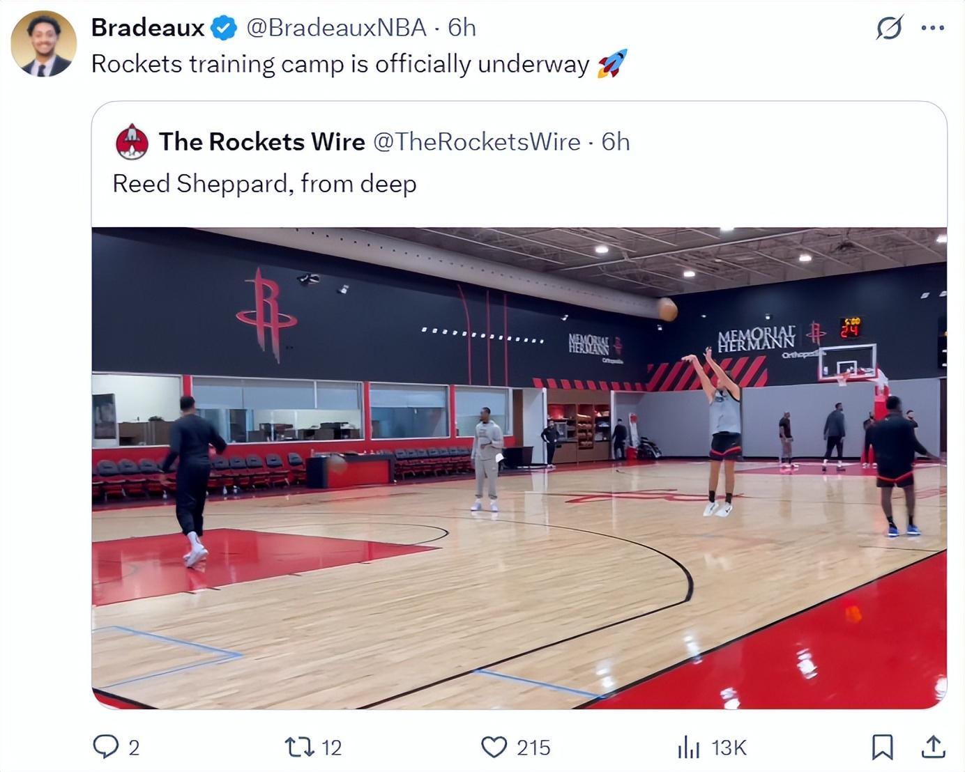 火箭记者Bradeaux在社交媒体上分享了谢泼德在合训后的加练情况。视频中,谢泼德连续命中两个超远三分球,展现了其出色的投射能力。尽管上赛季谢泼德的三分球命中率并不突出,但他在NCAA时期可是历史最伟大的三分手之一。如果新赛季谢泼德能将三分命中率提升至38%,火箭队的进攻空间无疑将得到进一步扩大。