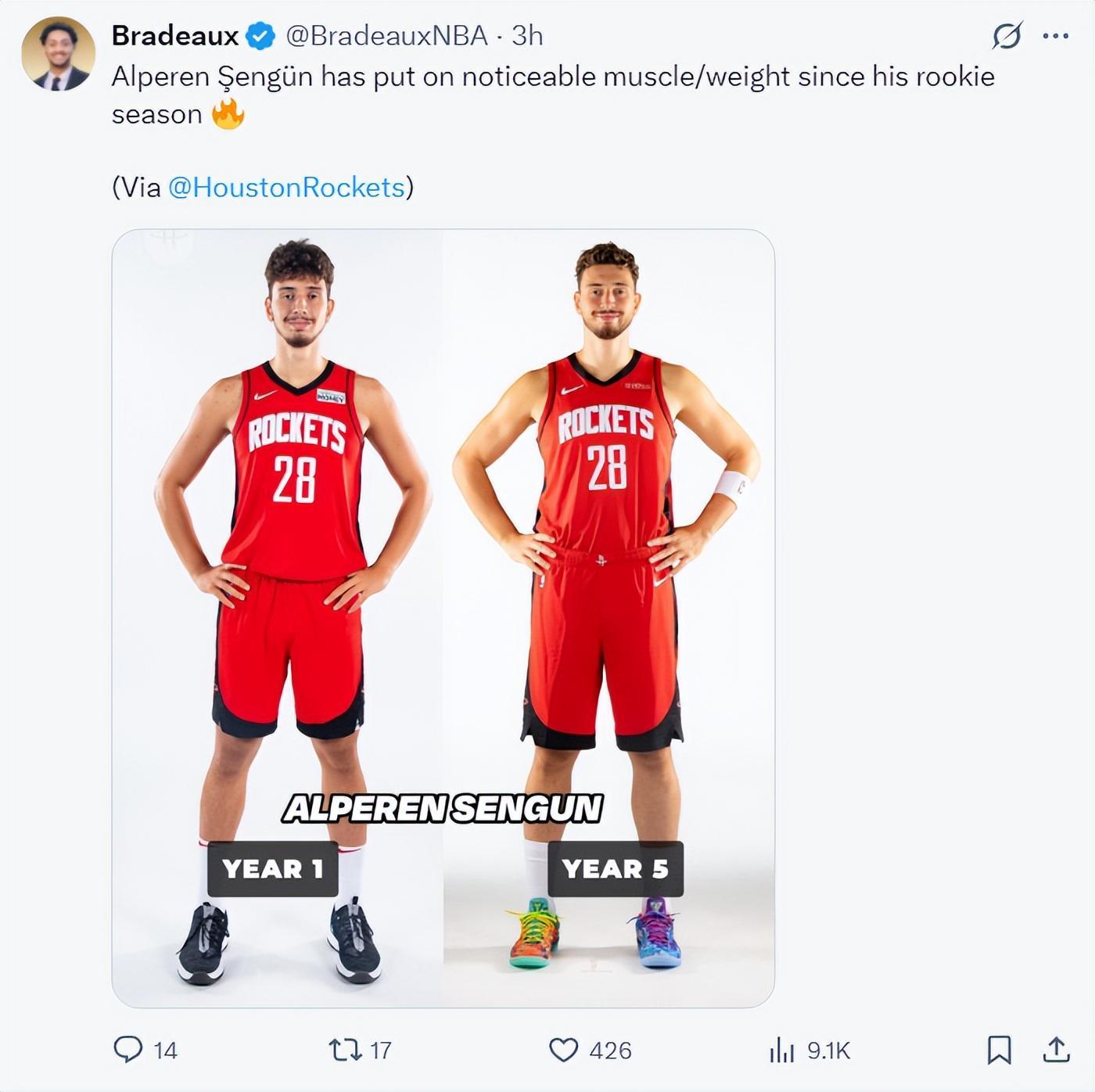 申京在合训后选择了加练罚球,正如他所说,休赛期除了打欧洲杯之外,他最多的时间就是用来训练罚球和三分球。从火箭记者晒出的申京第一年与第五年的定妆照对比来看,申京的增肌效果非常显著,甚至身高也似乎有所增长。