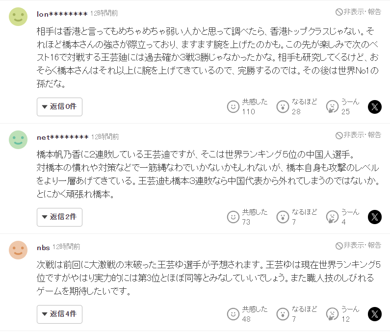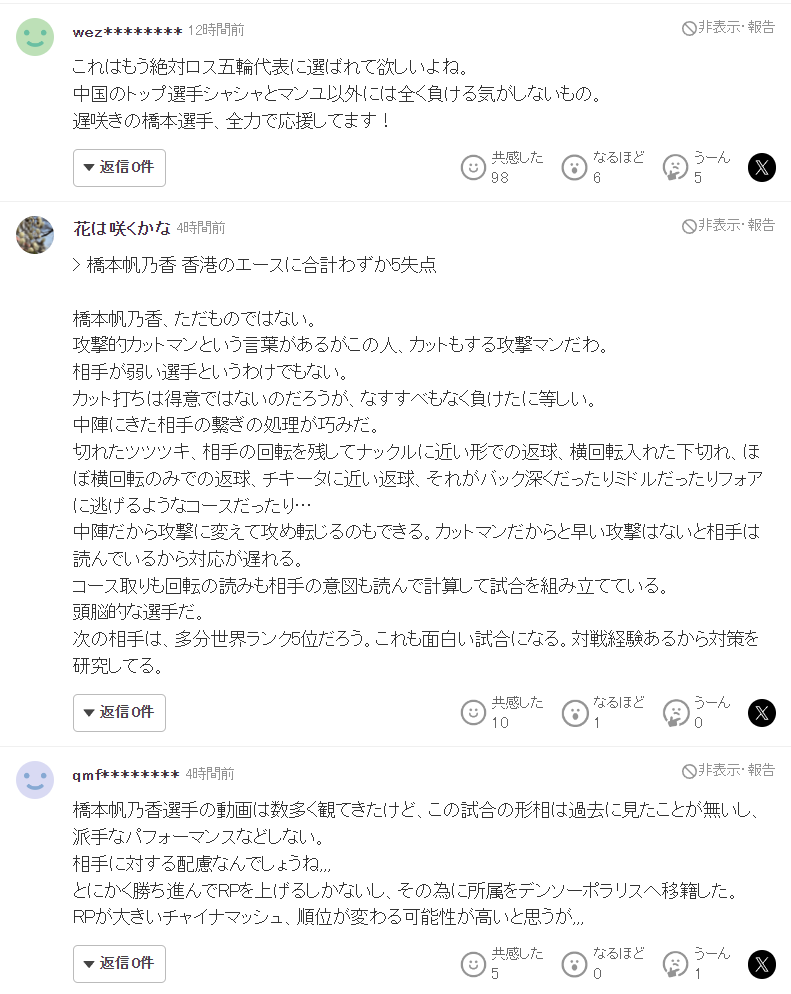 4. 桥本帆乃香无疑是洛奥周期的代表选手,除了中国最顶尖的王曼昱、孙颖莎之外,恐怕没人能击败她。我全力支持桥本选手,期待她能创造更多佳绩。