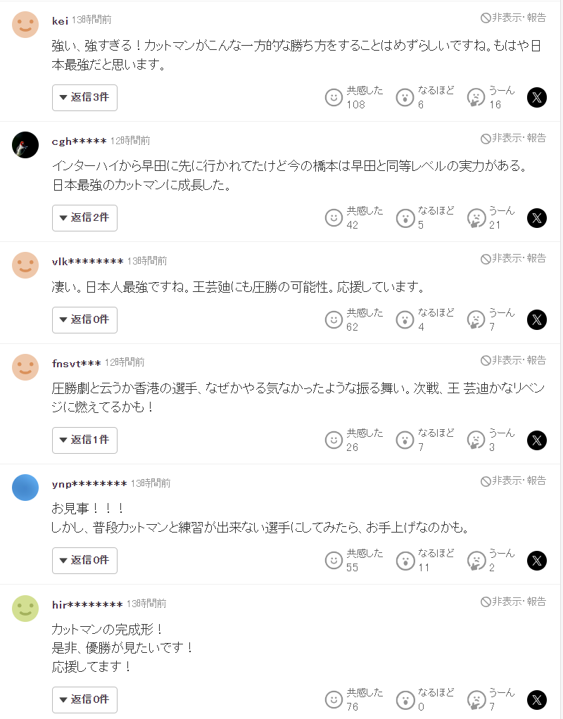 3. 想象一下王艺迪与桥本帆乃香的交手场景,王艺迪是世界前五的选手,实力与前三相差无几。这场中日对决,无疑将是一场精彩绝伦的比赛,我非常期待。
