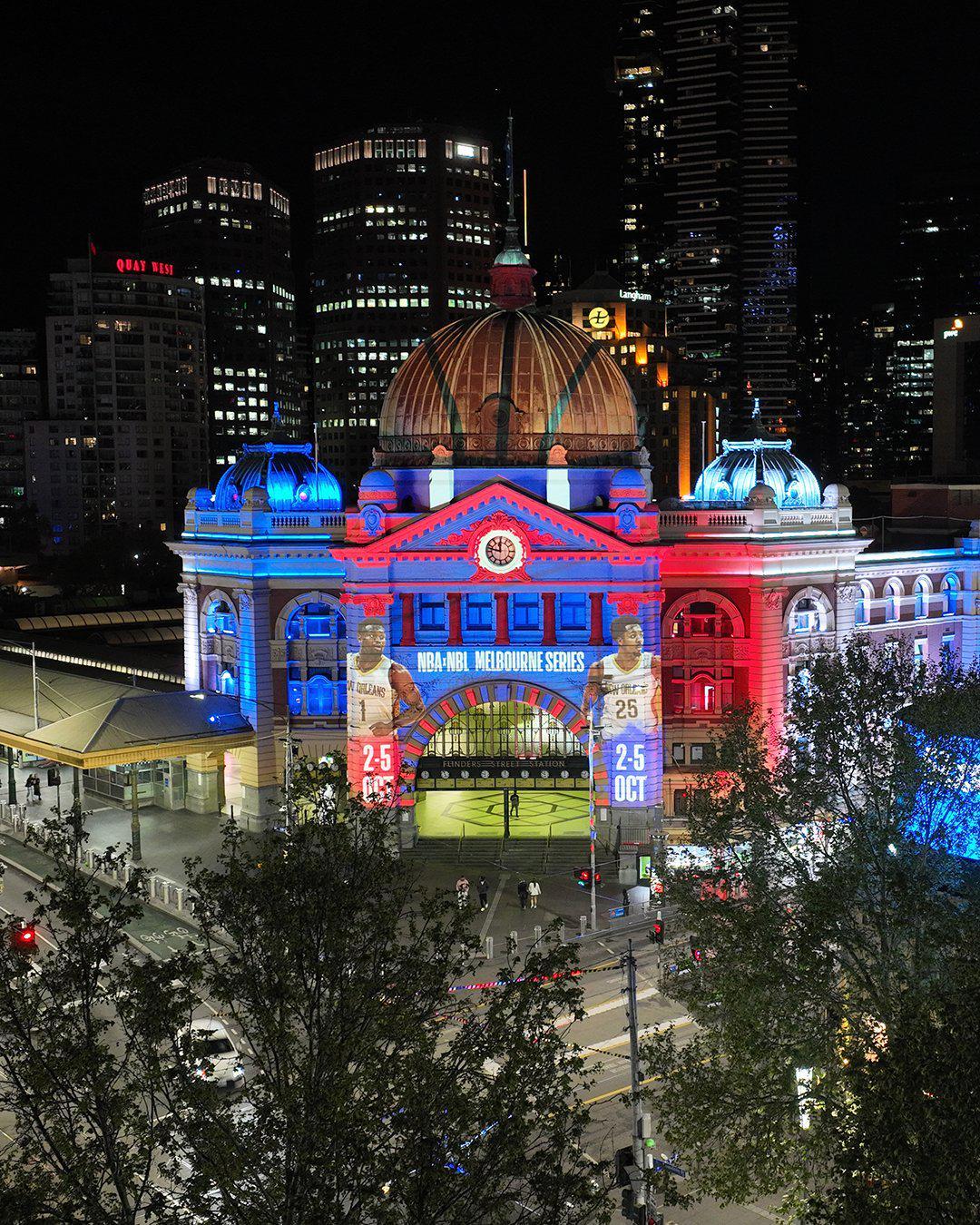 为迎接这场具有里程碑意义的赛事,鹈鹕队与澳大利亚国家篮球联赛(NBL)官方特别合作,以墨尔本标志性建筑菲林德街车站为背景,发布了系列预热宣传视频。视频中,这座维多利亚时期的建筑瑰宝在镜头下焕发新生,米黄色外墙与绿色穹顶在夜间灯光的映照下,尽显古典与现代的交融之美。