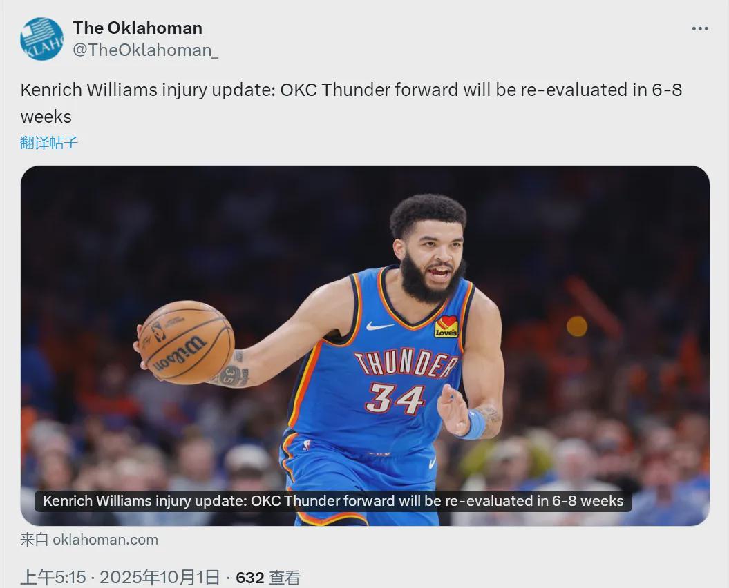 北京时间10月1日,俄克拉荷马城雷霆队官方发布伤情公告:主力前锋肯里奇-威廉姆斯(Kenrich Williams)接受左膝关节镜手术,预计6-8周后复查。这一消息为球队新赛季备战蒙上阴影,更令人担忧的是,这已是雷霆近两周内第二起重大伤病——首轮15号秀托马斯-索伯(Thomas Sober)在训练中遭遇右膝十字韧带撕裂,直接宣告2025-26赛季报销。