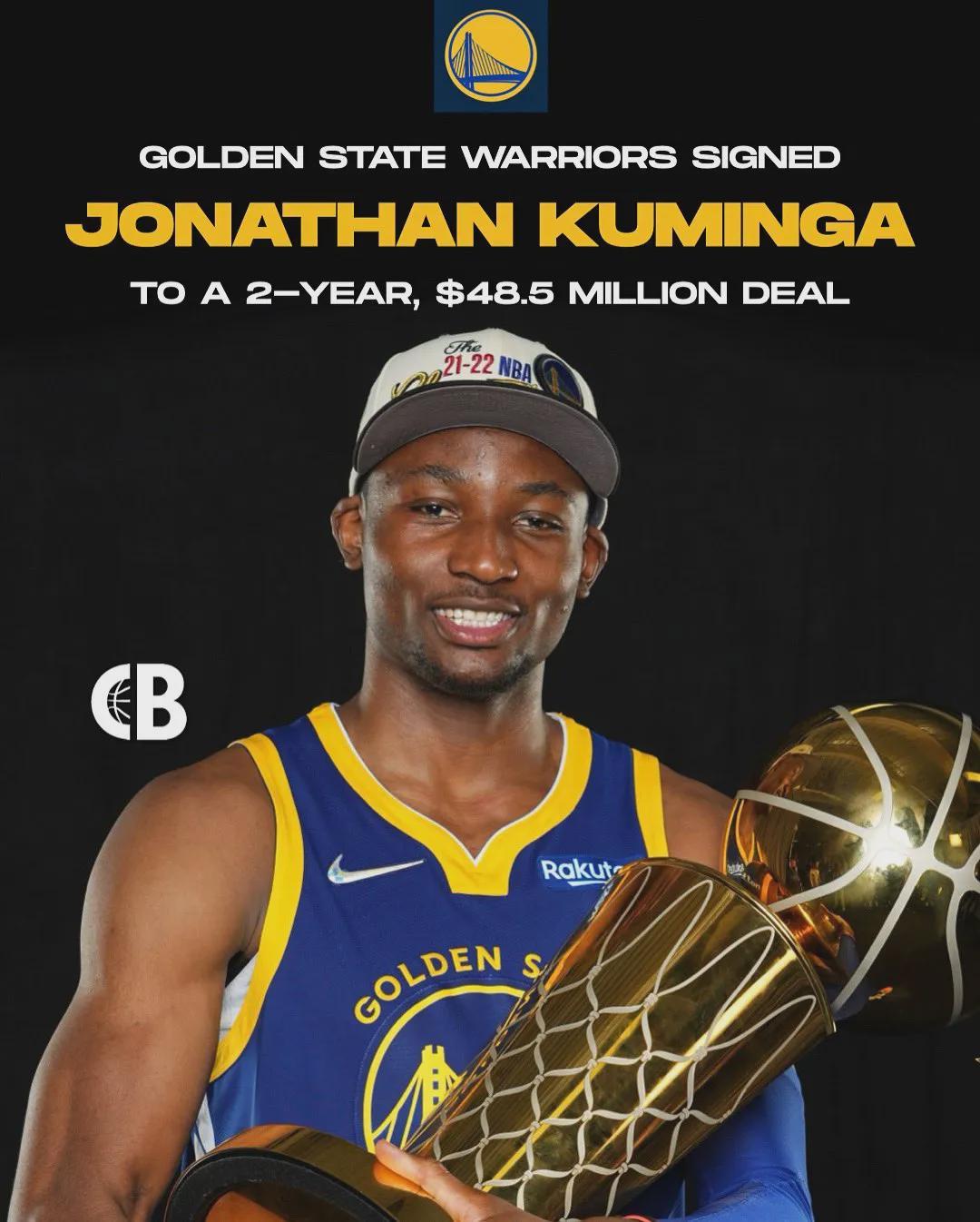 北京时间10月1日,NBA名记Shams带来重磅消息:库明加的经纪人阿隆-特纳透露,库明加已同意与勇士签下一份为期2年、总额4850万美元的续约合同,其中第二年为球队选项。根据劳资协议规定,库明加在2026年1月15日之前无法被交易,这意味着他至少还能在勇士效力半个赛季。