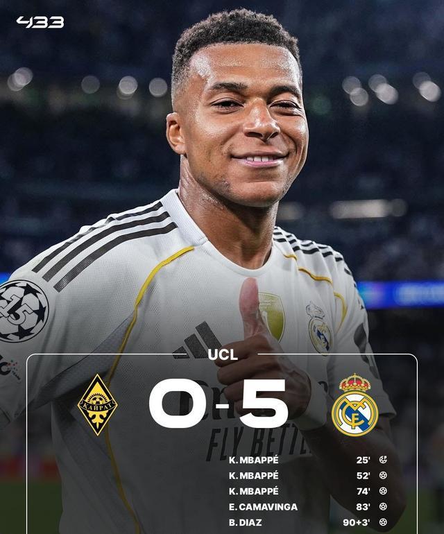 跨越8000公里远征哈萨克斯坦的皇马展现恐怖实力,全队身价14亿欧元对阵1273万欧元的阿拉木图凯拉特。比赛呈现一边倒态势:第23分钟姆巴佩点射首开纪录,第51分钟挑射梅开二度,第73分钟接罗德里戈助攻完成帽子戏法,个人欧冠进球数达60粒。