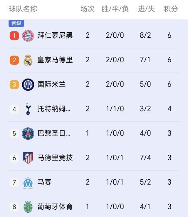 首日9场战罢,拜仁慕尼黑凭借净胜球优势领跑积分榜,皇马、国米同积6分紧随其后。热刺积4分位列第四,巴黎、马竞、马赛等队积3分组成中游集团。阿拉木图凯拉特0分垫底,本菲卡同样未尝胜绩。