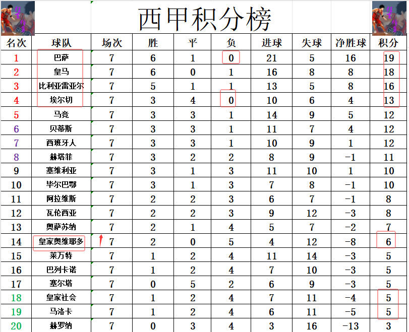 积分榜方面,本轮战罢,西甲无全胜球队。巴萨以1分优势反超皇马登顶,皇马跌至第2。升班马埃尔切保持不败,排名第4。皇家奥维耶多凭借本场胜利,反超皇家社会和塞尔塔,成功逃出降级区。
