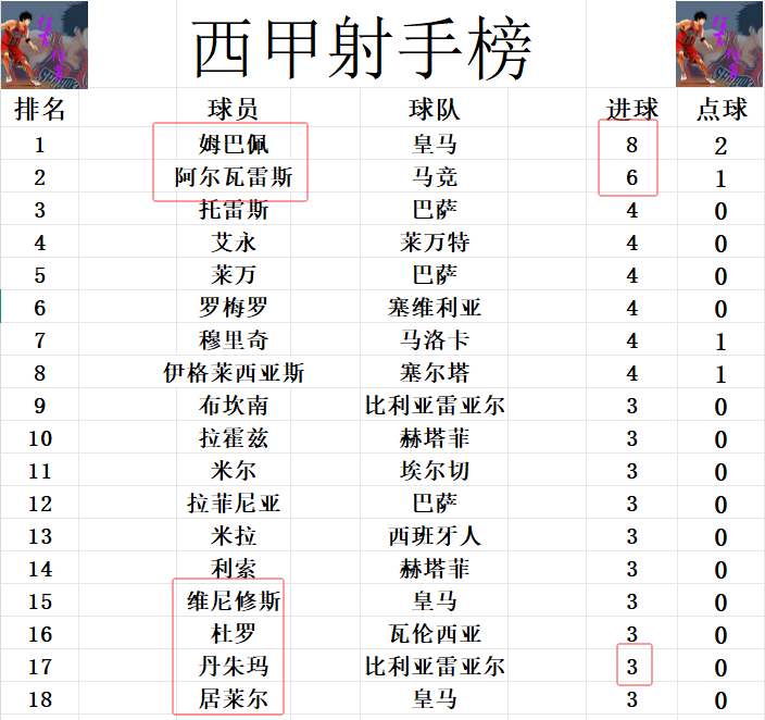 射手榜方面,姆巴佩以8球领跑,阿尔瓦雷斯6球紧随其后,托雷斯、莱万、穆里奇和伊格莱西亚斯等人以4球并列第3。丹朱玛本场破门但失点,以3球挤入前十。