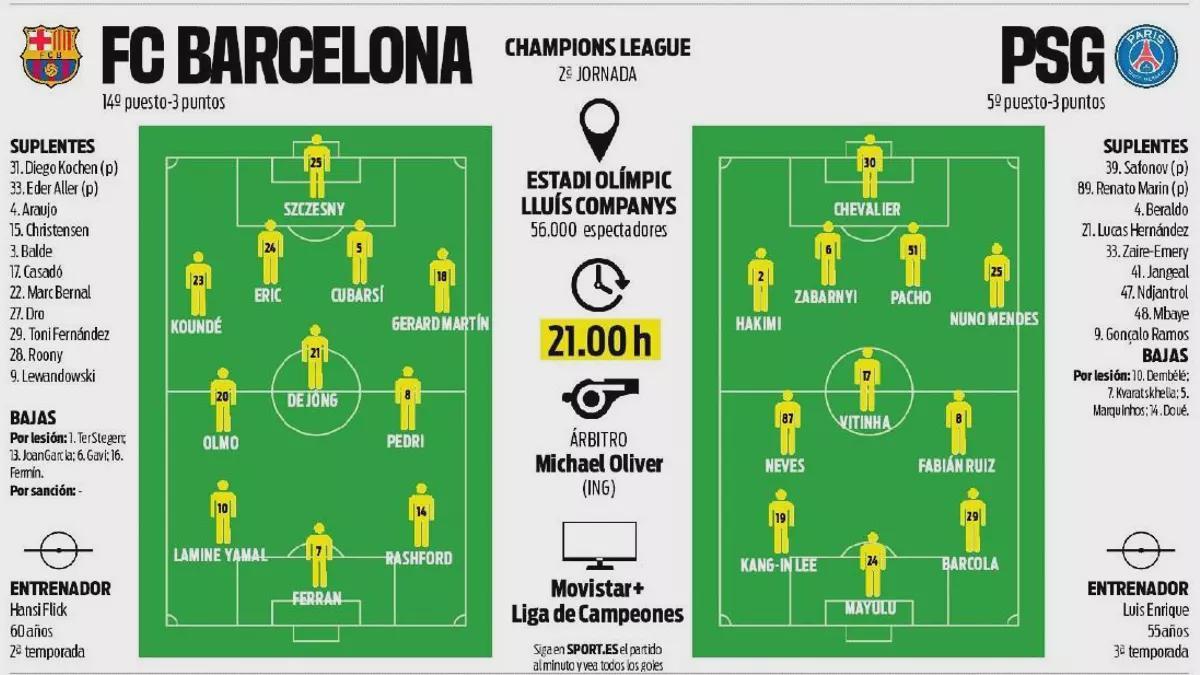 雷速体育10月1日讯 北京时间明日凌晨3:00,欧冠联赛阶段将迎来一场焦点对决,西甲豪门巴塞罗那坐镇主场诺坎普迎战法甲劲旅巴黎圣日耳曼。这场强强对话不仅关乎小组出线形势,更因两队巨星云集而备受关注。赛前,西班牙权威媒体《每日体育报》率先披露了双方可能派出的首发阵容。