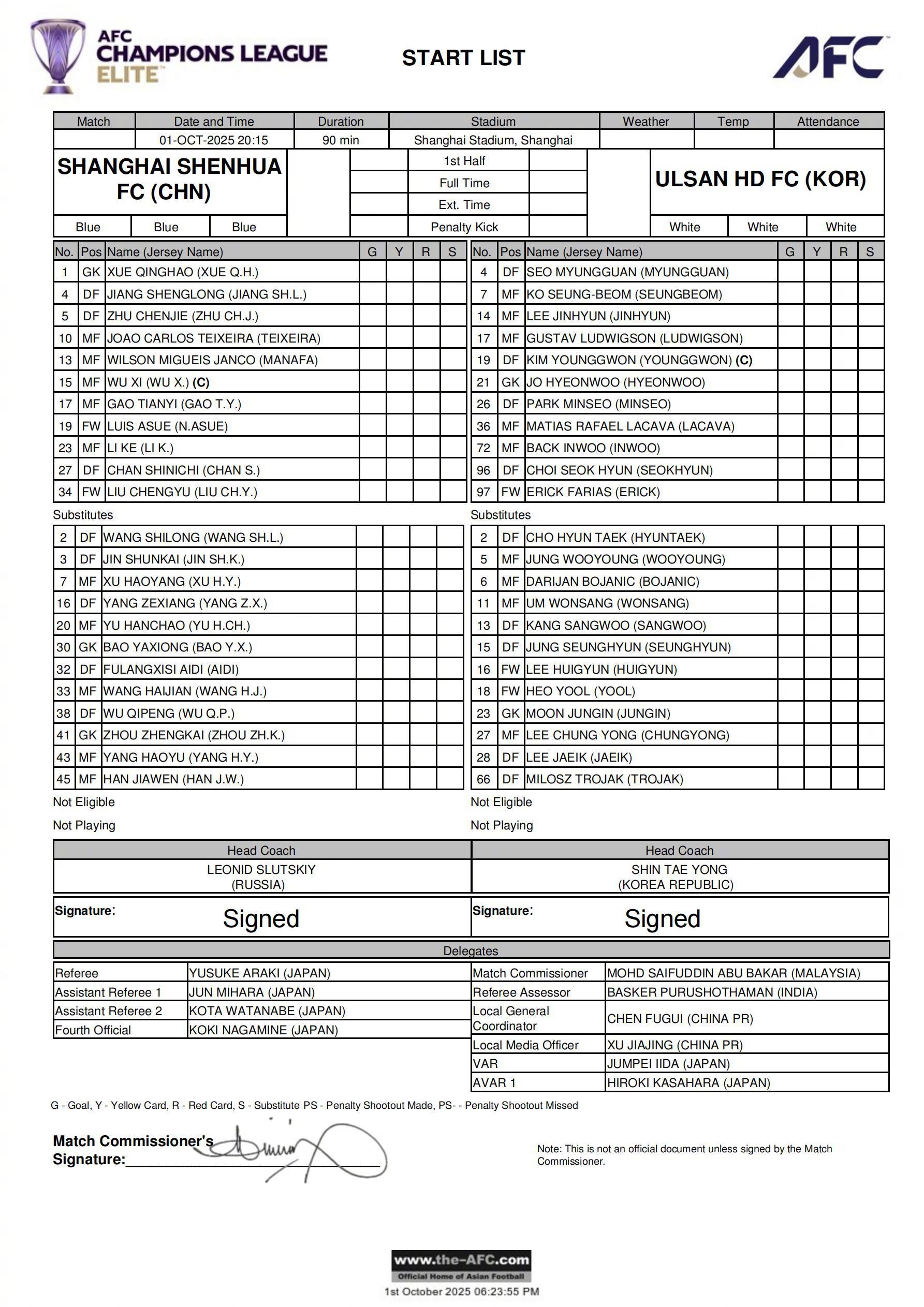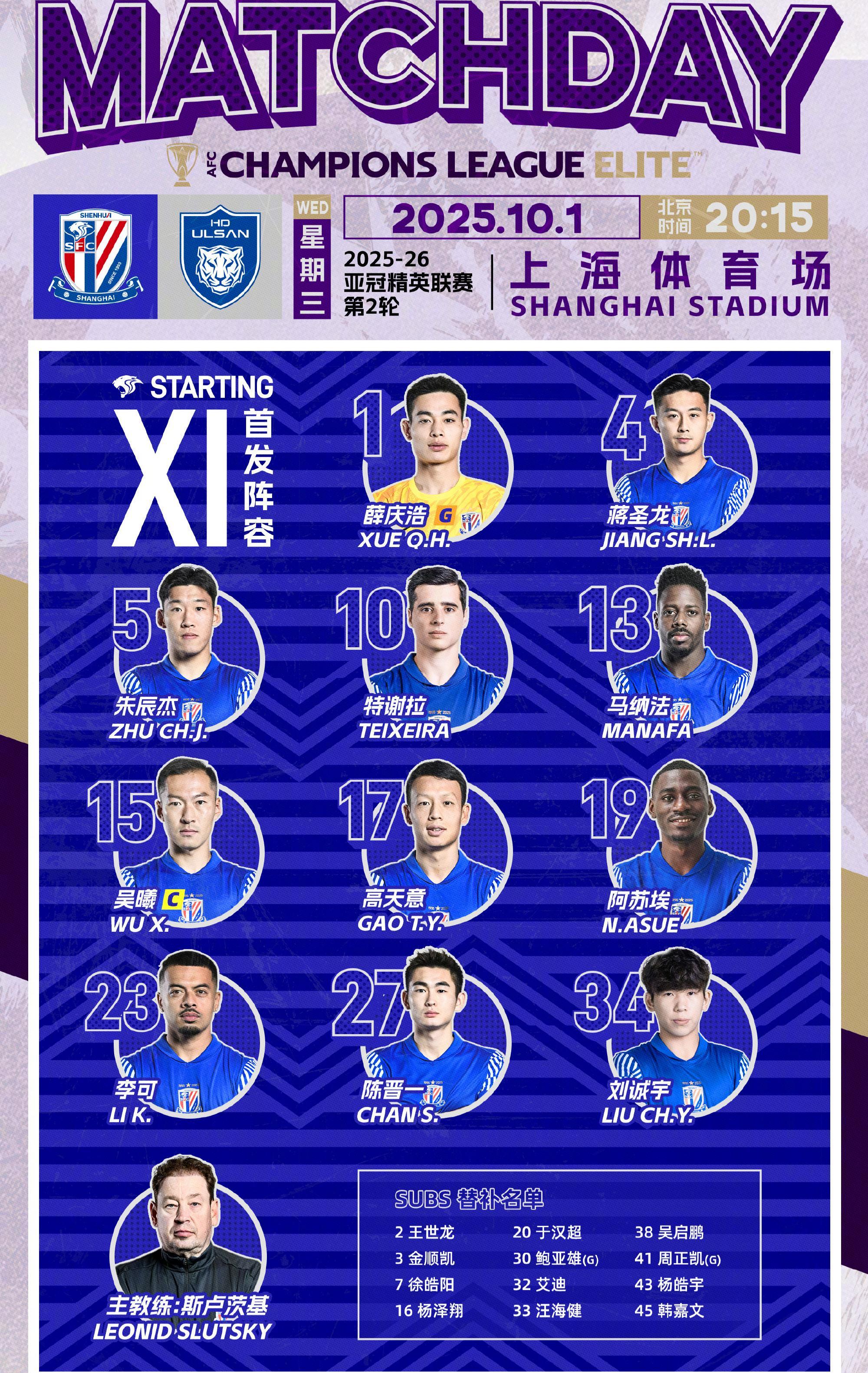 10月1日晚,2025/26赛季亚冠精英联赛第2轮迎来一场焦点对决,中超豪门上海申花坐镇上海体育场,迎战韩国K联赛劲旅蔚山HD。赛前,两队首发名单正式公布,引发球迷广泛关注。