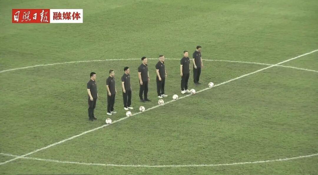 19点22分,现场迎来高光时刻。七位身着黑衣的日照代表,包括四位劳动模范,在全场近万名球迷的注视下走进中圈,进行开球仪式。这一刻,全场沸腾,掌声雷动。
