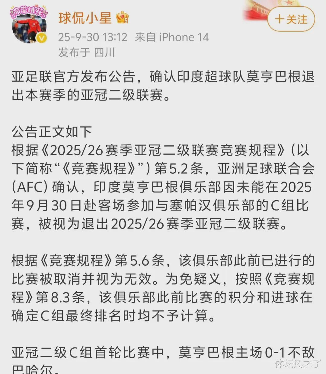 然而,尽管有泰山队的前车之鉴,本赛季却仍有球队步其后尘。北京时间9月30日,根据亚足联官网发布的一则公告,印超豪门莫亨巴根正式宣布退出本赛季的亚冠赛事。这一决定的背后,是俱乐部与亚足联在赛程及比赛地点调整问题上存在的严重分歧。由于双方未能达成一致,莫亨巴根最终选择了拒绝参赛。对此,亚足联迅速做出了强硬回应,宣布该队在本赛季亚冠所有轮次的比赛成绩无效,直接清零。