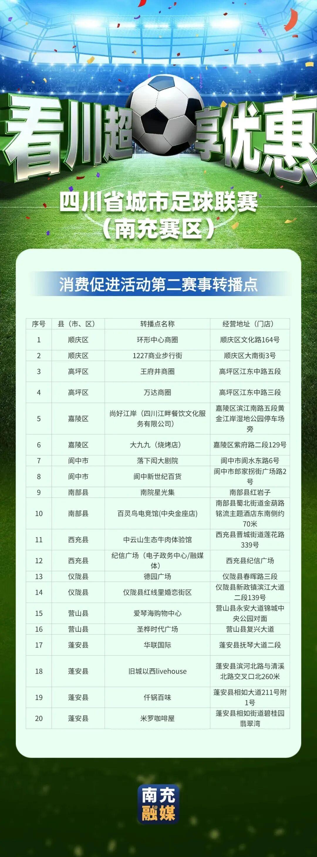 目前,顺庆环形中心、1227商圈、高坪王府井购物中心、高坪万达广场等多个大型商场及商业网点已设置第二观赛点,同步开启“川超”赛事直播。高清画面、实时音效,让现场观赛感“拉满”!