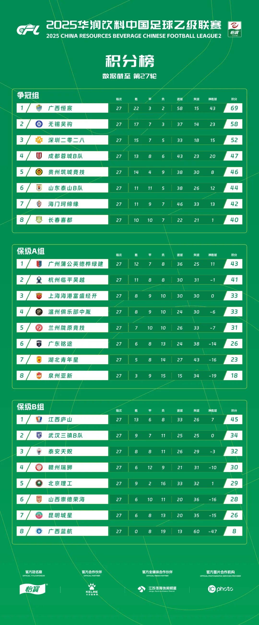 在中乙联赛第27轮过后,积分榜的排名发生了显著变化。广西恒宸凭借出色的表现,以69分的总积分提前3轮夺得本赛季中乙联赛的冠军,展现了强大的实力和稳定的发挥。而在保级组的竞争中,广州蒲公英德桦绿建、杭州临平吴越和上海海港富盛经开分列决赛阶段保级A组的前三名,成功保级;江西庐山、武汉三镇B队和泰安天贶则分列决赛阶段保级B组的前三名,同样完成了保级任务。