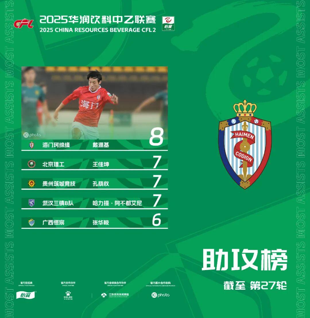在助攻榜上,海门珂缔缘的戴源基以8次助攻的数据领跑榜单,展现了其出色的传球和组织能力。而北京理工的王佳坤在第27轮比赛中贡献1次助攻,与贵州筑城竞技的孔荫权和武汉三镇B队的哈力提·阿不都艾尼并列助攻榜第二,他们的助攻为球队创造了更多的进攻机会。