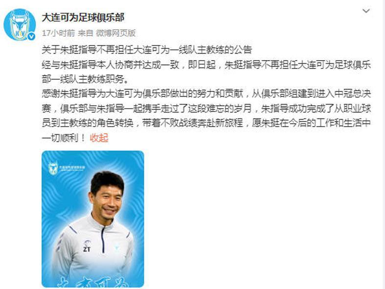 朱挺在自宣中表示:“由于战绩不佳,未达到俱乐部预期标准,经与大连可为俱乐部协商,即日起,本人不再担任大连可为俱乐部主教练职位。”他还写道:“一同战斗10轮正式比赛,共6胜4平,有惊喜也有遗憾,更多的是对自己能力不足的焦急忐忑。未来一定充分学习,夯实基础,努力提高业务水平,为大连足球做微薄的贡献,少说空话多干事实,用这次宝贵的联赛经验服务更多对足球有理想有憧憬的球员!”