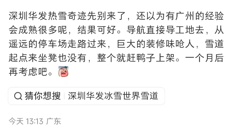此外,导航与人员指引问题也影响了体验。当日前来打卡的李先生向记者表示,他选择打车前往,但导航定位的下车点并非雪场入口附近,需顶着太阳步行一段时间才能找到;途中他多次向工作人员询问路线,但有部分工作人员指引表述模糊,显然对场地不太熟悉。