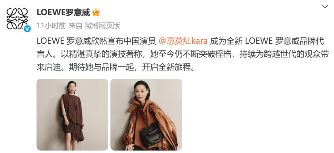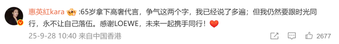 2025年9月28日,国际奢侈品牌LOEWE(罗意威)通过官方渠道宣布,中国香港资深演员惠英红正式成为其全球品牌代言人。这一消息迅速引发网络热议,惠英红在品牌官宣微博下的评论成为焦点:“65岁拿下高奢代言,争气这两个字,我已经说了多遍。”