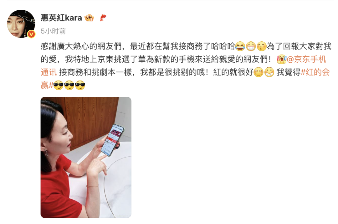 值得一提的是,惠英红在商业代言领域同样表现亮眼。今年6月11日,京东手机通讯正式宣布其为品牌代言人,海报上“红的会赢”四字醒目且充满力量感,相关话题#京东真的找了惠英红#迅速登上热搜。此前,美团外卖与饿了么分别邀请黄龄、蓝盈莹推出魔性广告,网友曾建议京东“找惠英红接招”,如今这一提议竟成现实。