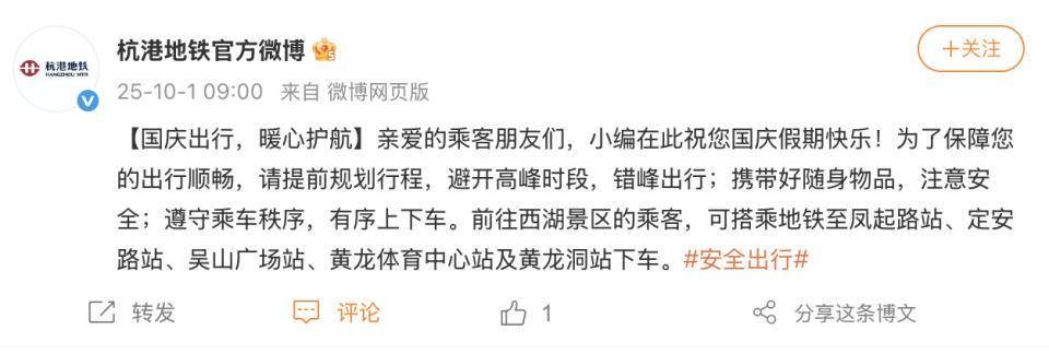 杭州地铁发布最新通知:为了保障出行顺畅,请提前规划行程,避开高峰时段,错峰出行;携带好随身物品,注意安全;遵守乘车秩序,有序上下车。前往西湖景区的乘客,可搭乘地铁至凤起路站、定安路站、吴山广场站、黄龙体育中心站及黄龙洞站下车。