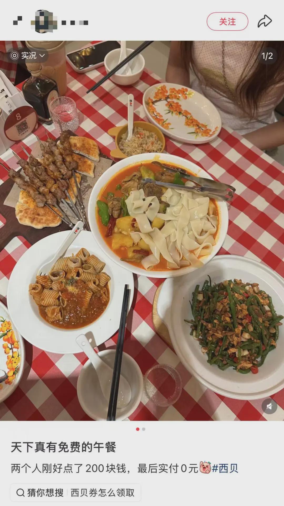 社交媒体上,不少网友晒出了自己用代金券后的价格。有网友表示,“两个人刚好点了200块钱,最后实付0元。”这一消息迅速引发了其他网友的羡慕和热议。