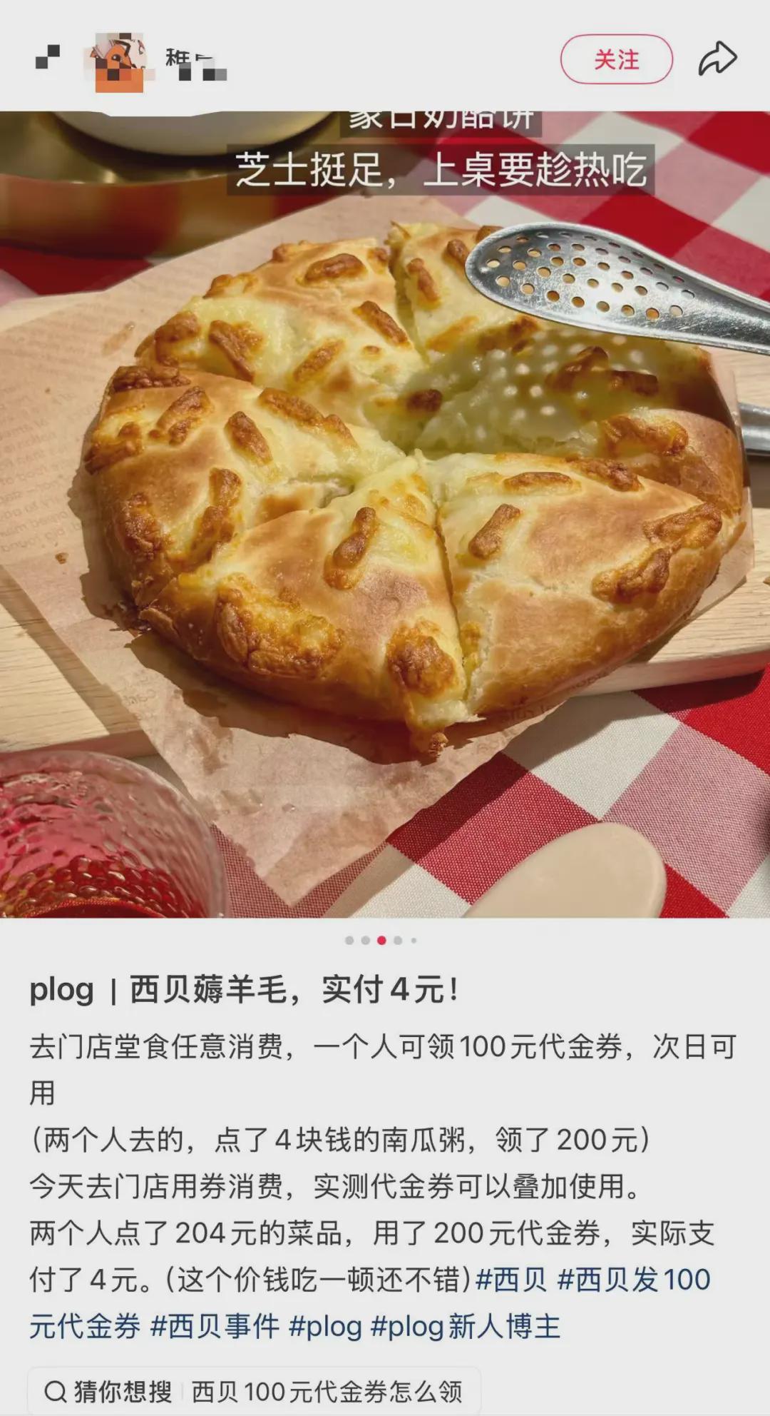 更有网友详细分享了自己的消费经历。一位网友发文称,“西贝现在到店任意消费就送100元无门槛可累加代金券。我们四个人到店买了个大花卷、肉夹馍*2、枣糕,然后四个人用四个微信扫码领取了4张100块。第二天到店消费了417元,抵用消费券实际支付17元。”还有网友表示,之前两个人在西贝门店点了4块钱的南瓜粥,领了200元代金券。“今天去门店消费,两个人点了204元的菜品,实际支付了4元。”