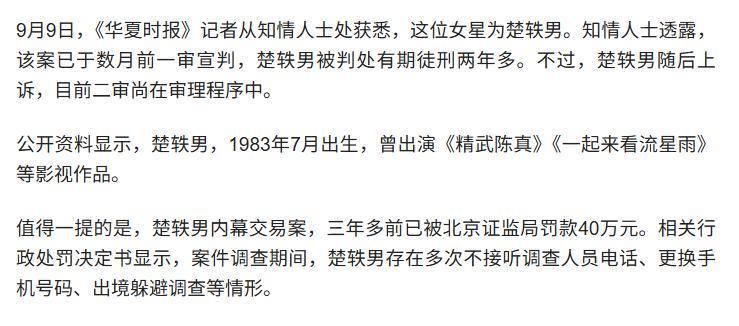 这一行为被证监会认定为内幕交易,今年九月就有知情人士透露,楚轶男一审被判处有期徒刑两年多,目前案件处于二审阶段。