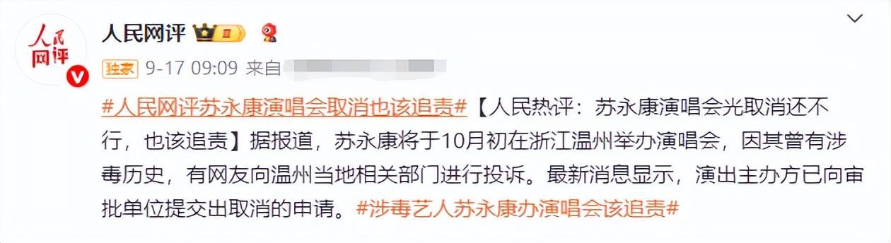 人民网更是直接发文怒批“涉毒艺人苏永康办演唱会应该追责”。