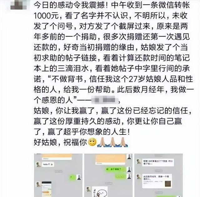 有人想多转一些,比如一个刚被公司裁员的大哥转了2000元,但她退回了一千,坚持只收一千,怕记乱,会按计划还款。一个大学生也转来了一千元,说是半个月的生活费,他表示自己可以吃泡面先救急。她记下了他的学号,后来寄了两本专业书给他。