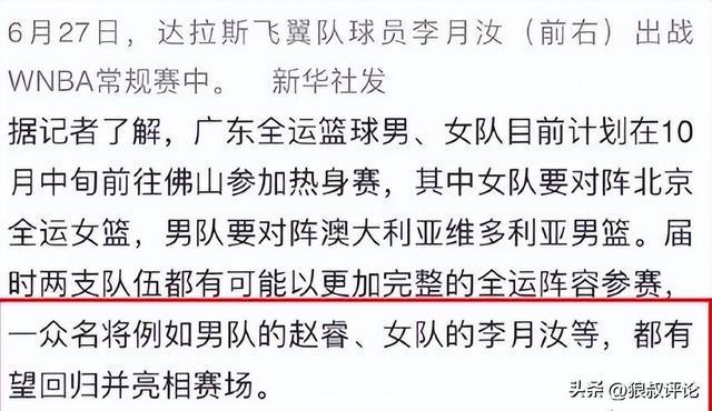 北京时间10月1日,根据《南方都市日报》最新消息,本月中旬在佛山举行的全运会热身赛上,备受关注的WNBA中国女篮国手李月汝有望迎来回归,并亮相赛场。除男篮国手赵睿外,李月汝的复出将成为本次赛事的一大看点。