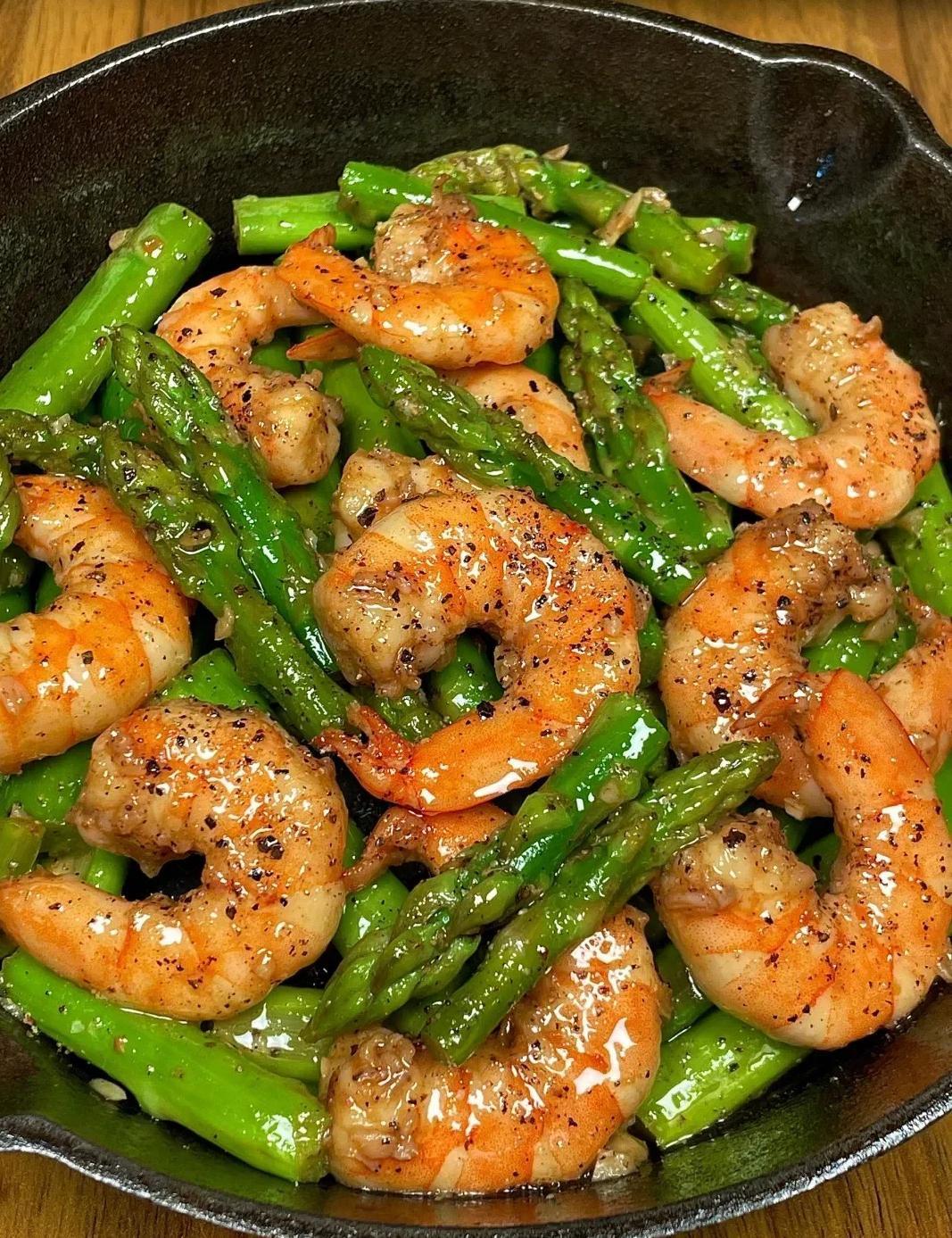 热锅凉油,放入虾仁快速划散,一变色就盛出来。用锅里的底油爆香蒜片,倒入焯好的芦笋,大火翻炒几下。