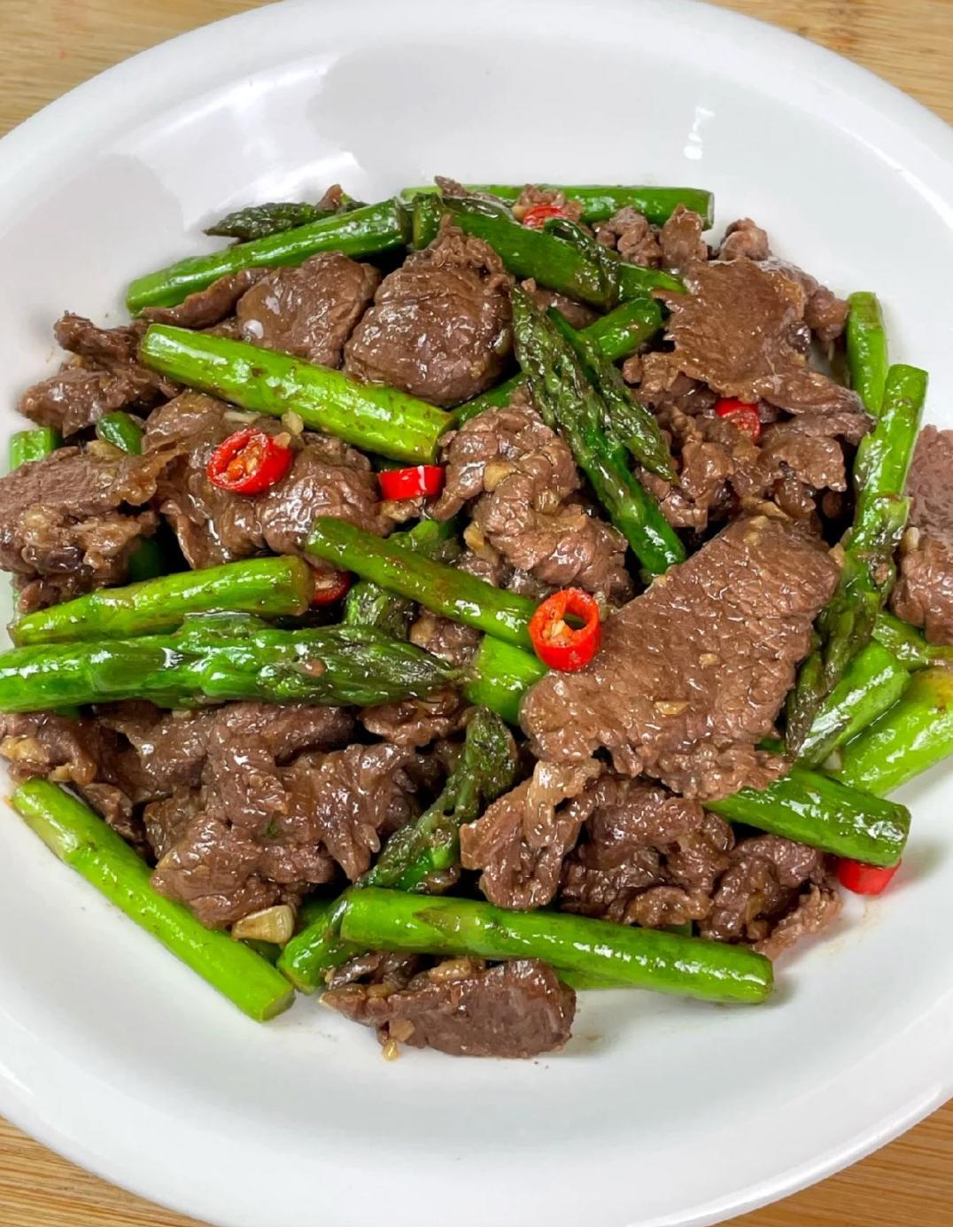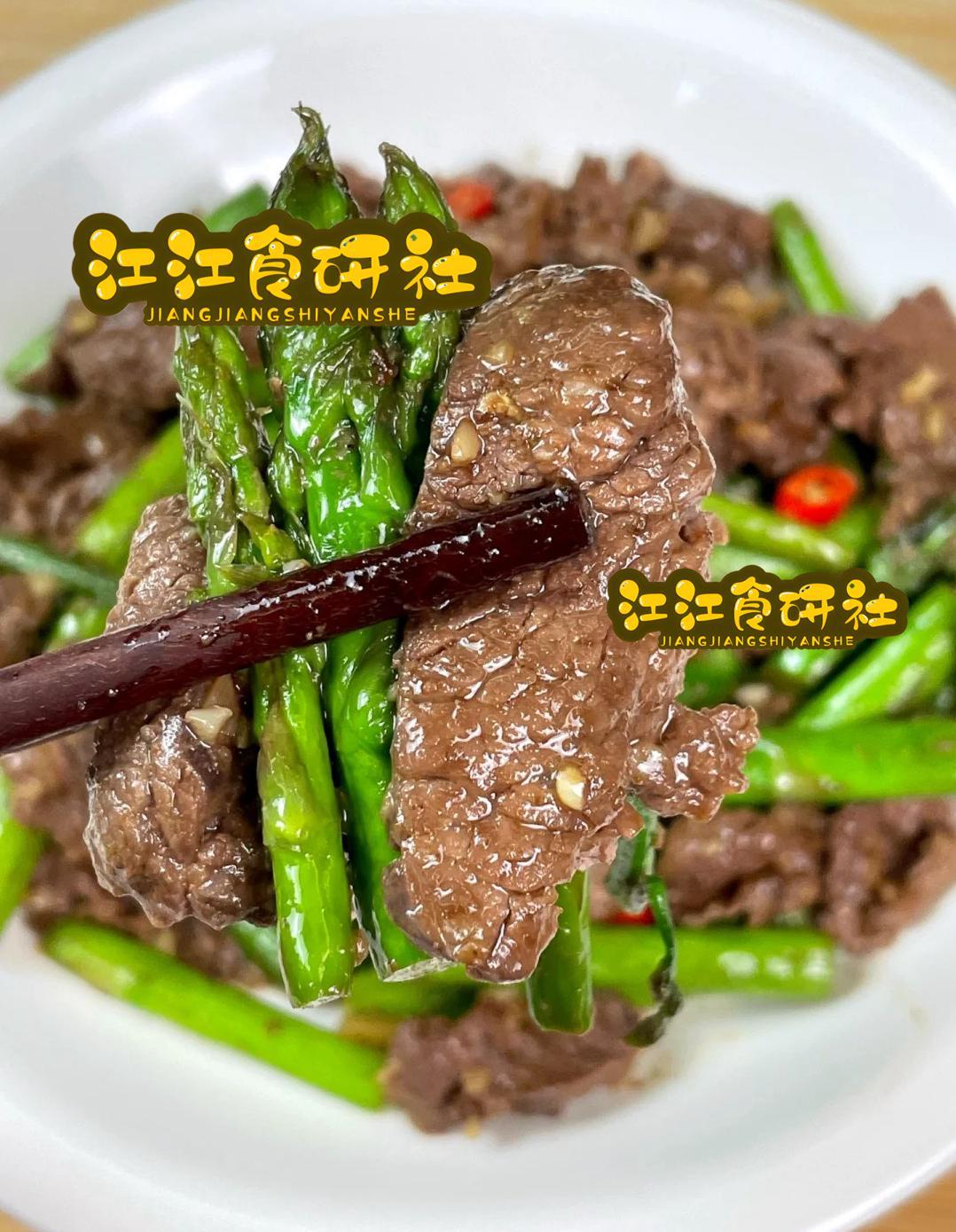 锅里留底油,爆香姜丝蒜末,下芦笋翻炒,再倒入牛肉片,快速翻炒,沿锅边淋入少许料酒炝锅增香,加盐调味,炒匀立刻关火。牛肉嫩滑,芦笋清脆,超级下饭!