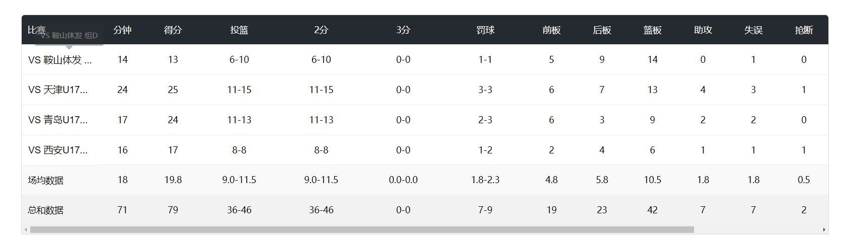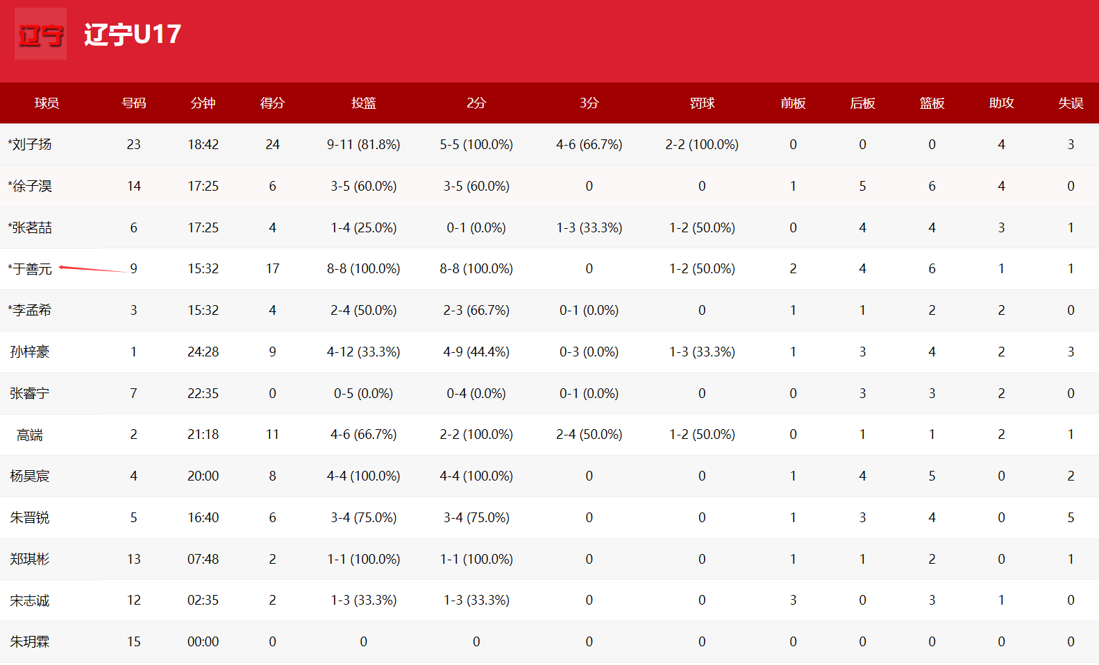 本场比赛最耀眼的明星当属辽宁男篮一队的17岁新星于善元。这位被破格提拔至一队的小将延续火热状态,仅出战15分钟便8投8中,罚球2中1,高效砍下17分6篮板1助攻1抢断2盖帽,命中率达到惊人的100%,以全胜战绩提前打卡下班。这也是他职业生涯首次以100%命中率完成比赛。