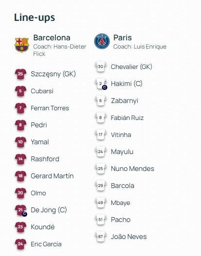 作为欧冠历史上最具话题性的对决之一,巴萨与巴黎的碰撞向来充满火药味。本场比赛中,巴萨方面由佩德里领衔中场,这位西班牙国脚将与巴黎中场核心维蒂尼亚展开技术流对话。锋线端,17岁天才亚马尔的突破能力与拉什福德的速度冲击形成鲜明对比,而巴黎阵中姆巴佩的缺席让战局增添更多变数。