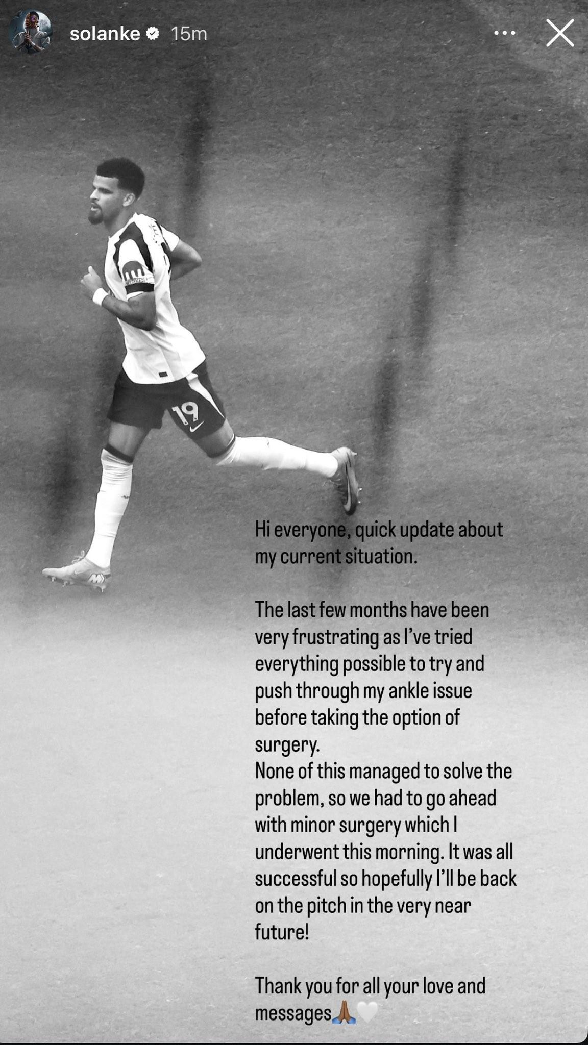 北京时间10月2日,英超劲旅托特纳姆热刺队的前锋多米尼克·索兰克在社交媒体上宣布,自己已经接受了脚踝手术,并将因此伤停一段时间。