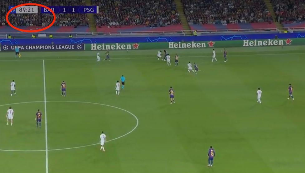 此后长达50分钟的时间里,两队都无法再次破门。第89分钟,巴萨后场控球。此刻,巴黎开始全场逼抢。89分钟20秒,巴黎成功断球。巴黎球员并不着急反击,他们将球回传。