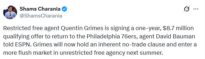 Shams分析指出,76人队通过资质报价保留了格雷姆斯的“伯德权”(Bird Rights),这使球队在2026年夏天拥有主动权:既可直接与成为完全自由球员的格雷姆斯续约,也可通过先签后换获取资产。若格雷姆斯本赛季被交易,新东家仅拥有“非伯德权”,届时为其提供超过1050万美元起薪需动用薪资空间或特例条款。