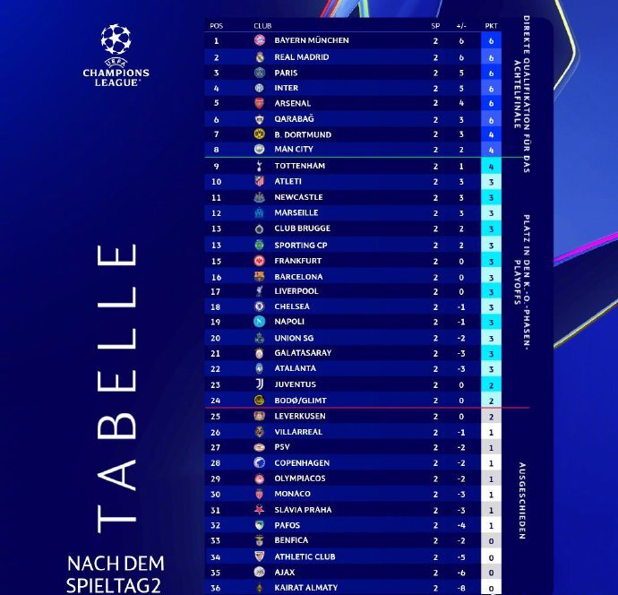 北京时间10月2日,随着欧冠联赛阶段第2轮比赛的全部结束,最新的积分榜也迎来了翻天覆地的变化。各支球队的表现差异显著,有的豪门球队稳坐积分榜前列,而有的则陷入困境。