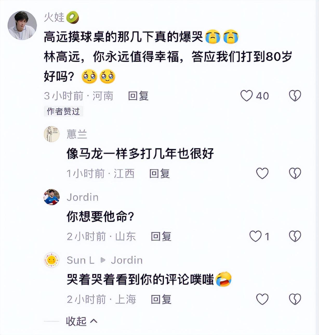 有球迷在社交媒体上上传了林高远失利后摸球台的视频,并留言表示:“看到林高远摸球台那几下,我真的爆哭了,希望他能多打几年。”这句话道出了无数球迷的心声。