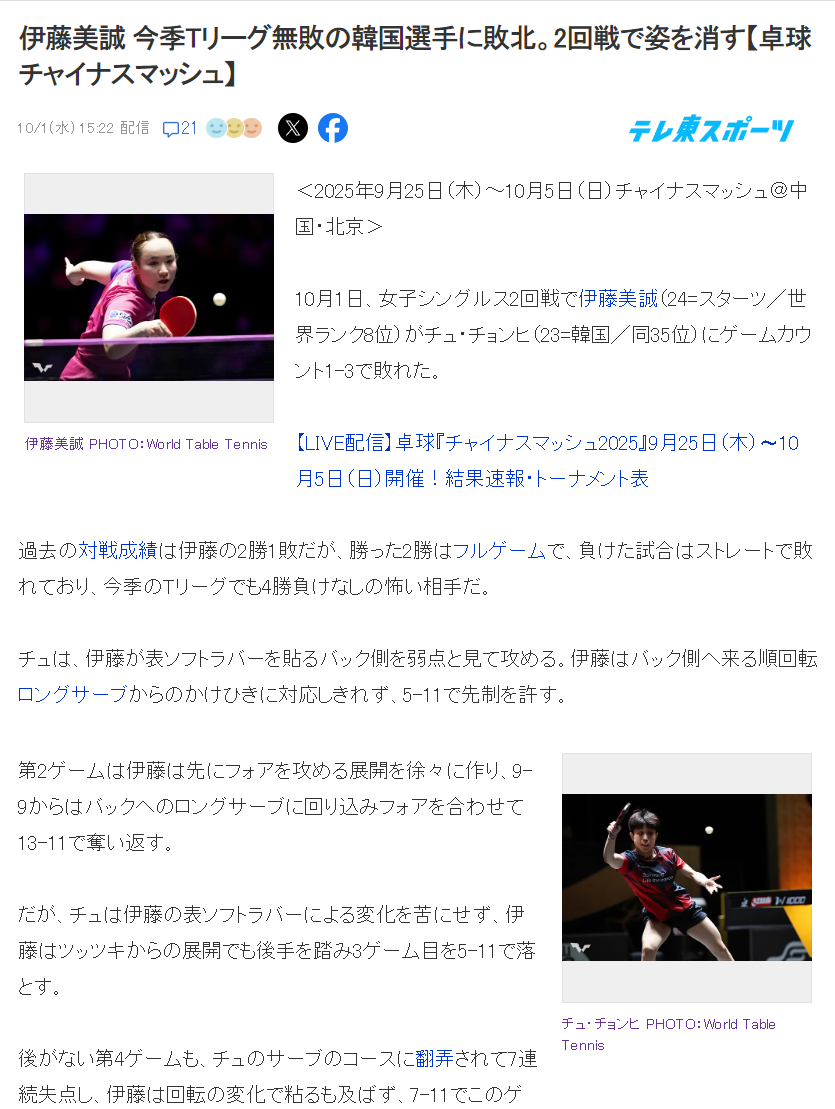 北京时间10月2日,WTT北京大满贯女单1/16决赛上演了一场焦点对决,日本乒乓球队主力选手伊藤美诚以1-3的比分不敌韩国选手朱芊曦,遗憾止步32强。四局比分分别为:5-11、13-11、5-11、7-11。除了第二局伊藤美诚艰难取胜外,其余三局均遭遇惨败。作为世界排名第八、日本女队第二高的选手,这样的成绩显然不尽如人意。