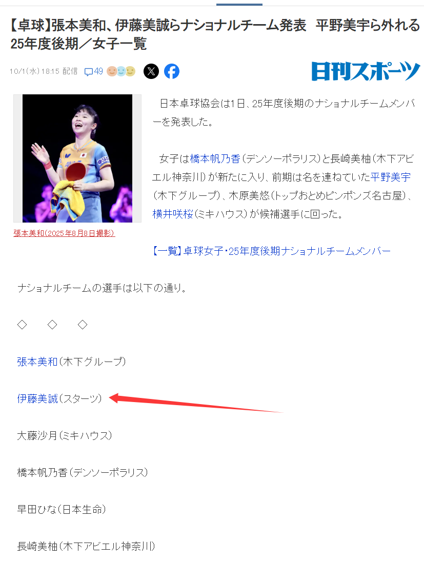 尽管伊藤美诚的状态持续下滑,但日本乒协并未放弃她。在刚刚公布的2025下半年日本乒乓球队女队一队名单中,伊藤美诚依然位列其中,与张本美和、大藤沙月、桥本帆乃香、早田希娜、长崎美柚等选手一同构成了日本女队的核心阵容。