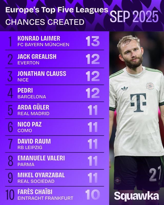 10月1日,知名数据机构Squawka公布了五大联赛九月份的创造机会统计数据,引发了球迷和媒体的广泛关注。在这份榜单中,拜仁慕尼黑的边后卫莱默尔以出色的表现脱颖而出,成为五大联赛中创造机会最多的球员。