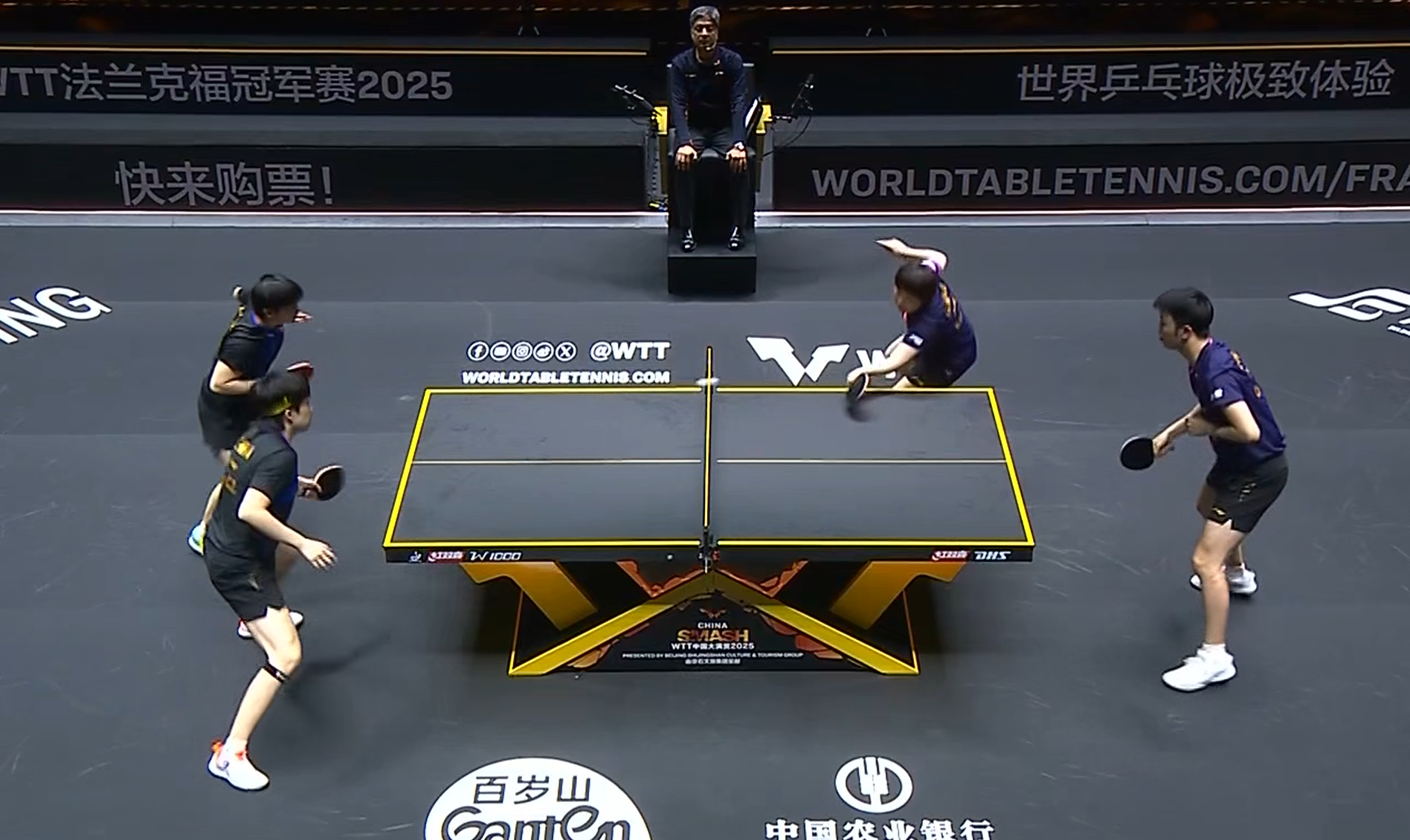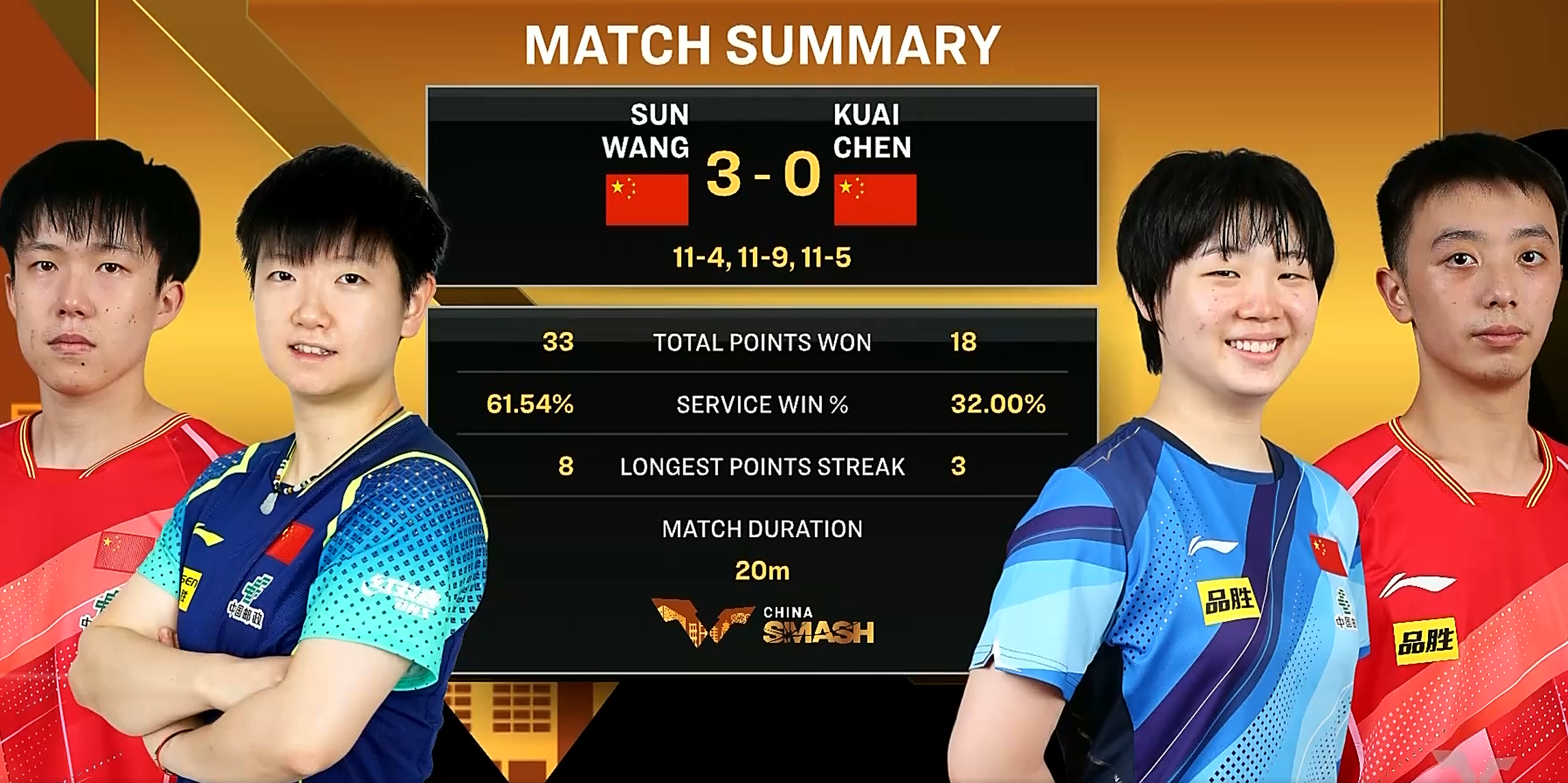 首局比赛,双方开局阶段都出现了较多吃发球的情况,比分一度紧咬至3平。然而,随着比赛的深入,王楚钦/孙颖莎逐渐找到了节奏,凭借更高的球质和更快的速度,给陈垣宇/蒯曼带来了巨大的压力。技术层面的差距逐渐显现,王楚钦/孙颖莎连得6分,以9-3领先,并最终以11-4拿下首局,为比赛奠定了基调。