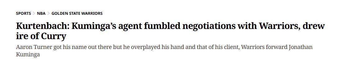 事实上,库明加与勇士队的关系在休赛期已经变得紧张。他的经纪人特纳在薪资谈判中的强硬态度,甚至激怒了勇士队的核心球员库里。库里在被问及库明加索要更高薪资的问题时,公开表示:“我只听我的队友说的,我不听经纪人、代理人说的。”这一表态被Dieter Kurtenbach视为库里对库明加经纪人的“公开处刑”。