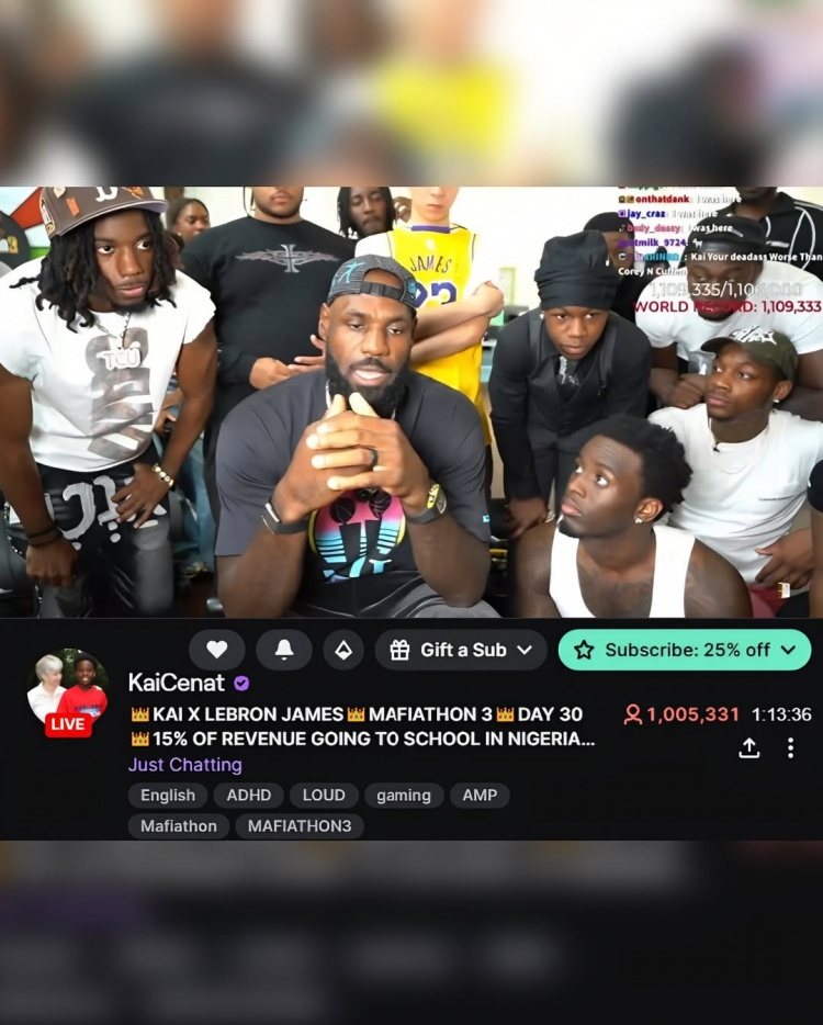 对于深耕YouTube等平台的凯-塞纳特而言,此次合作堪称「职业生涯高光时刻」。尽管此前已积累数百万粉丝,但72万的在线峰值始终是其难以突破的天花板。詹姆斯的空降犹如注入强心剂——从直播预热阶段的粉丝期待,到正式亮相后的互动狂欢,在线人数呈指数级增长,最终稳稳站上百万量级。