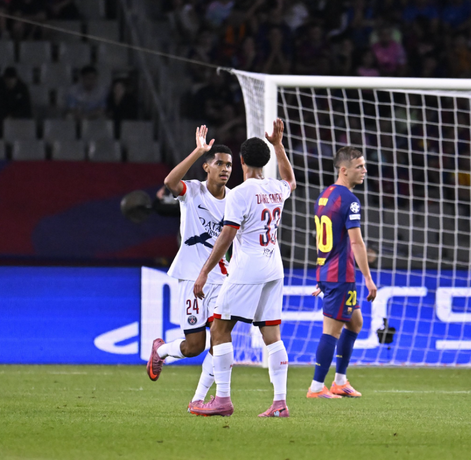 第24分钟,亚马尔中场被断,巴尔科拉反击机会处理不妥当让大巴黎错过扳平比分。第27分钟,马尤卢禁区前沿尝试远射高出了横梁。第30分钟,阿什拉夫任意球直接射门,什琴斯尼飞身将球扑出。逐渐打出攻势的大巴黎还是抓住了机会,第38分钟,门德斯左路发挥速度优势连过孔德和德、库巴西后横传助攻,马尤卢推射破门,1:1!第41分钟,巴尔科拉强突杀入禁区打门,皮球高出横梁,巴萨差点再丢一球。