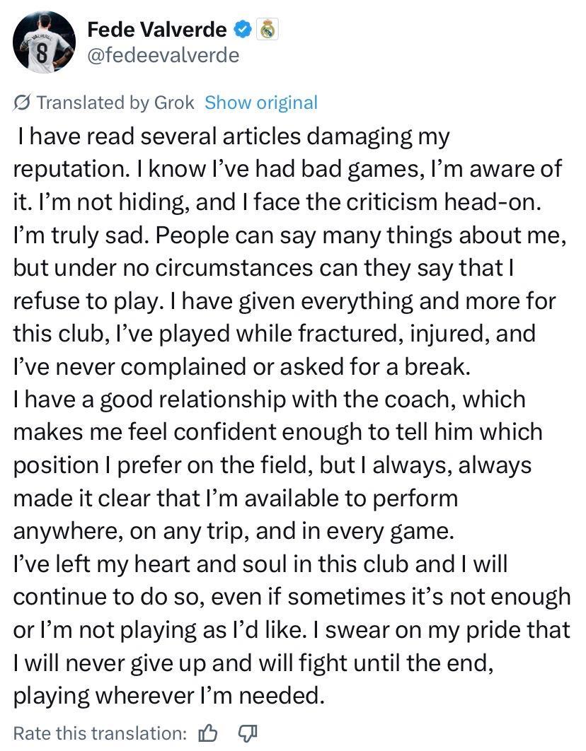 事实上,巴尔韦德在皇马以多面手著称,在安切洛蒂麾下曾尝试过多个位置,且从未公开表达过不满,更未与俱乐部及主教练发生冲突。他在社交媒体上进一步澄清道:“我与教练保持着良好关系,这使我有信心告诉他我在场上最喜欢的位置,但自始至终,我都明确表示愿意在任何地点,任何旅途中,所有比赛中听从调遣。”尽管对右后卫位置不太满意,但只要球队需要,巴尔韦德总是会毫不犹豫地服从主教练的安排。