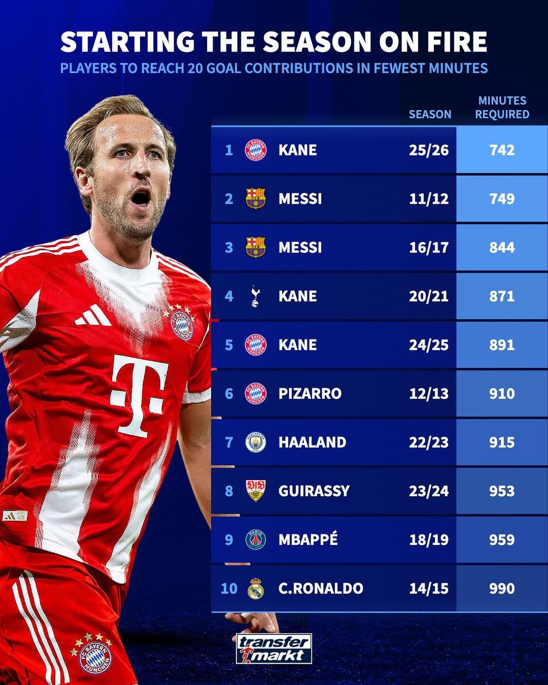 凯恩此次的突破,不仅展现了其作为顶级射手的全面能力(进球+助攻),更体现了其在新赛季适应德甲联赛的高效性。值得一提的是,这是凯恩职业生涯第三次跻身该榜单前5,此前他曾在20/21赛季(热刺)和24/25赛季(拜仁)分别以871分钟和891分钟位列第4和第5。