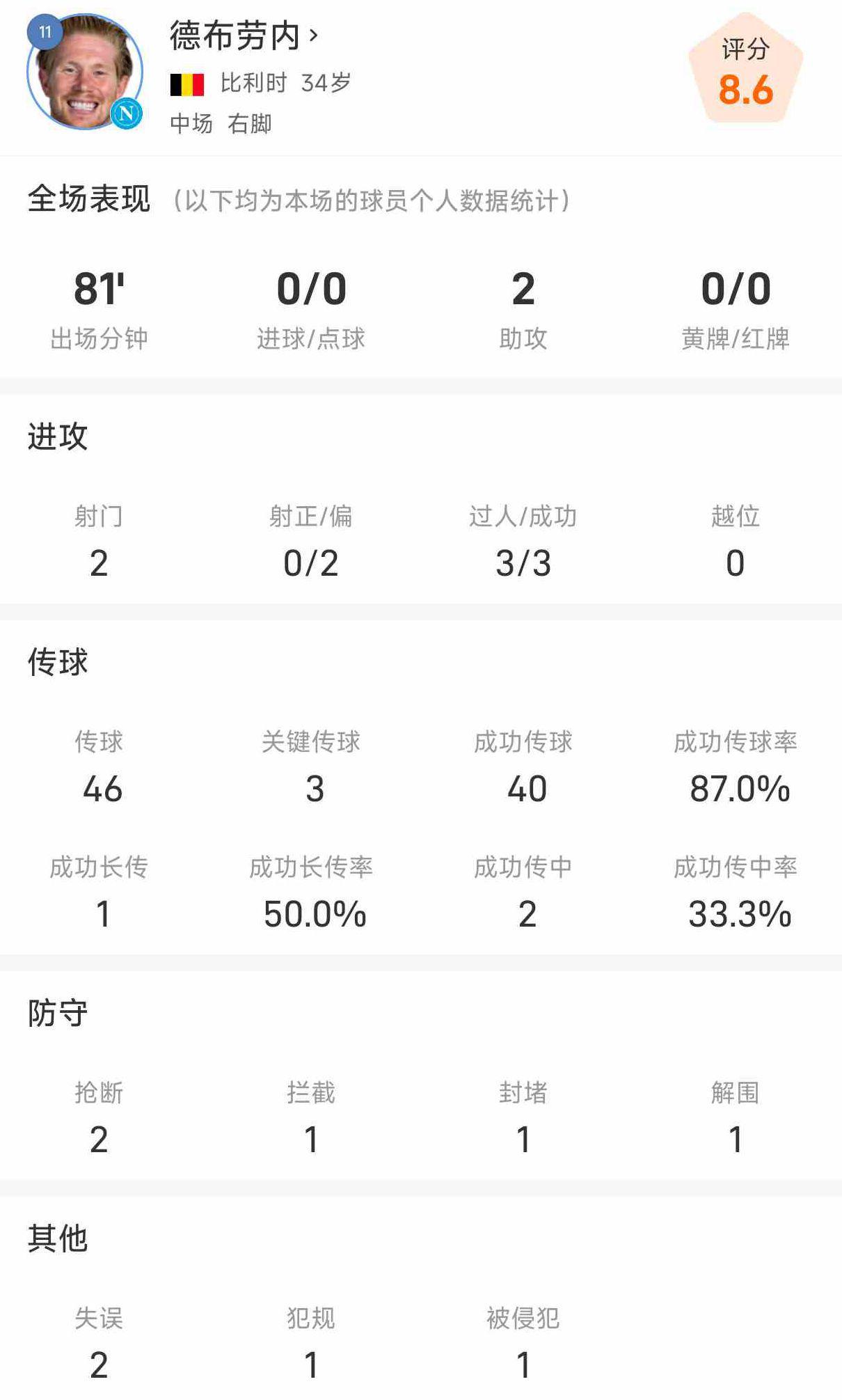 尽管在比赛中也出现2次传球失误、1次犯规以及1次被对手侵犯的情况,但整体表现依然可圈可点。德布劳内用全面的数据证明了自己在攻防两端的巨大价值。
